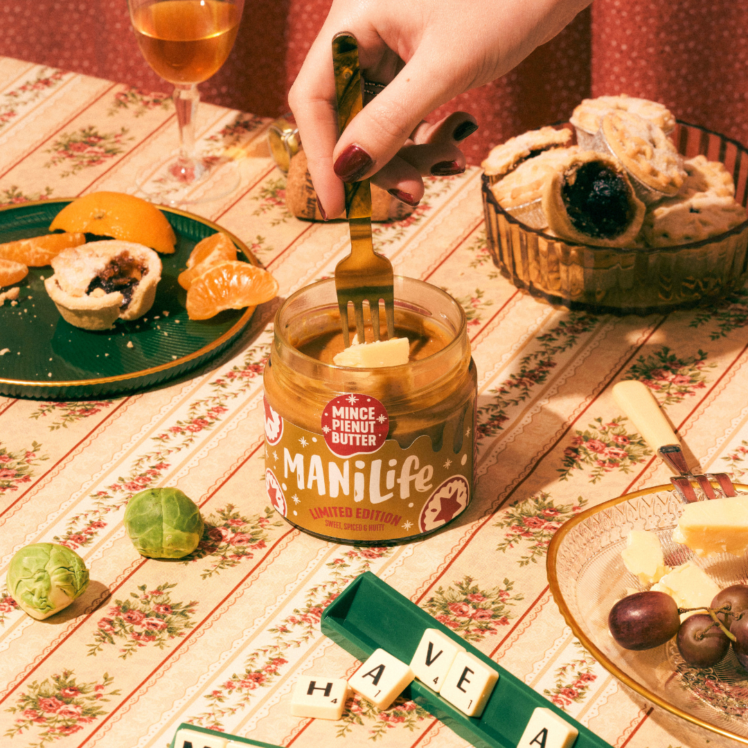 Inside, you'll find two jars of our limited-edition Mince Pienut Butter (yep, the one that tastes like someone has mixed a mince pie into the smoothest peanut butter) and a ManiLife Matchbox (for, you know, lighting said pudding responsibly... or for making your shelf look pretty).